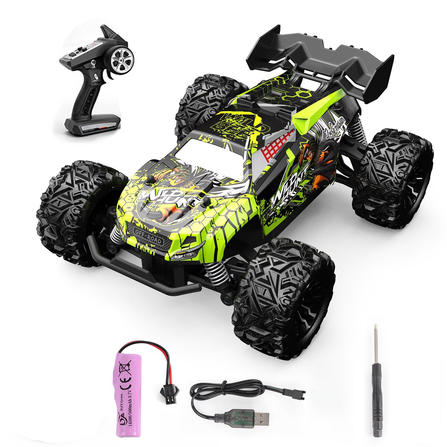 Tires: Equipped with lifting wheels and simulated tires of monster truck, with strong grip. The maximum control distance is about 120 meters, which is very suitable for outdoor racing. About 70km/h (extreme speed), break through the speed to win. Color box packaging is very suitable for giving to RC lovers.
