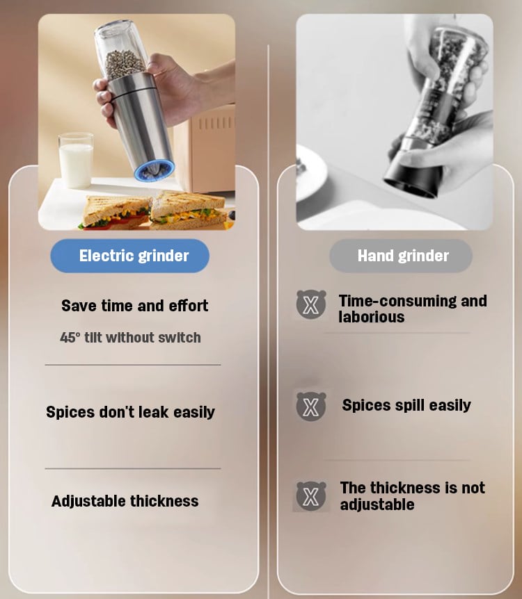 Our amazing Automatic Electric Gravity Induction Salt and Pepper Grinder has an advanced gravity sensing design, no need for manual grinding!