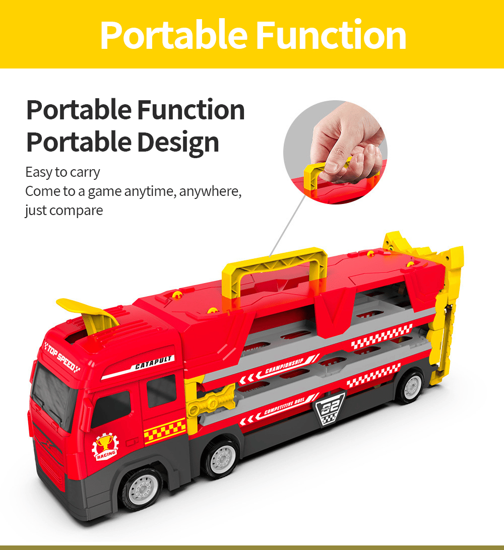2-in-1 Transforming Vehicle: More great features that make this big hauler mega unique— connect and Deformation to track and roll your cars onto a side-by-side race. Layer upon layer, load your favorite cars, lift and go!
