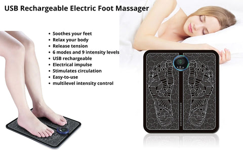 This EMS electric foot massager pad has advantages beyond merely massaging your feet; it also aids in body relaxation. This EMS foot massager increases circulation relaxes muscles and relieves foot and leg discomfort. It features six settings and nine intensities. It is well-made, long-lasting, and simple to use. It aids in relieving aching and worn-out feet. USB-recharging capability.