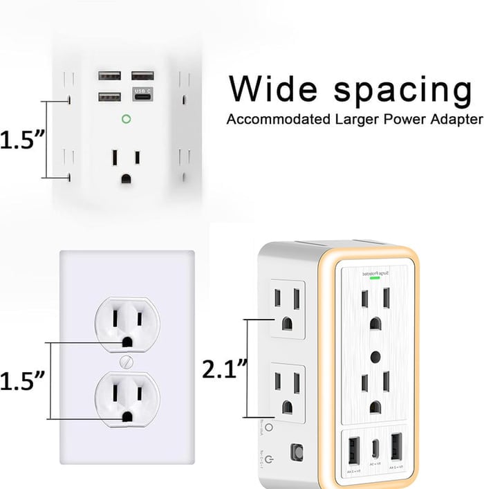 9 IN 1 multifunctional Outlet-6 AC outlets with 2.1 inches long space in between,2USB A & 1USB C Smart Charging Ports(Total 3.4A)Smart night light with touch sensor, three levels ofadjustable brightness let you choose the right amount oflight for your own needs.