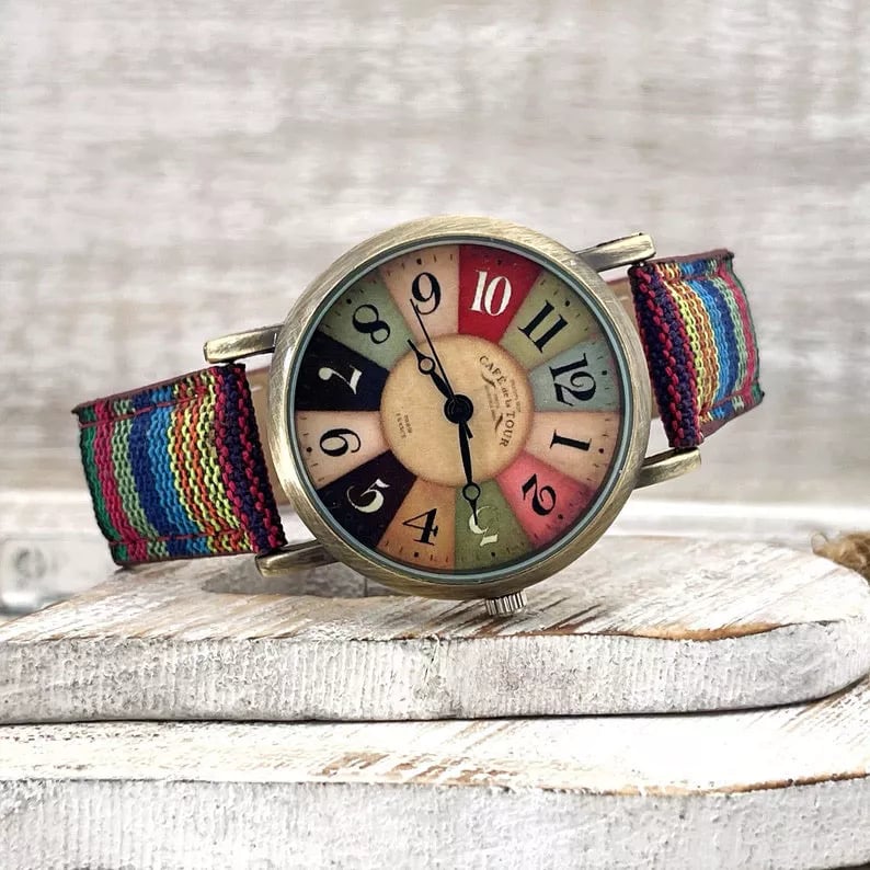 This is one classy watch! You can dress it up or down and it goes and shows with everything! The face is creative with a nice subtle contrast to the woven band.