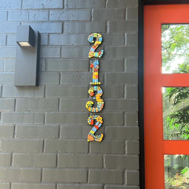 These beautiful numbers are now created on a waterproof base made by Skeewbacker. Each number is created with a high density waterproof polystyrene core and a waterproof membrane on both sides. It does not contain cement, fiberglass, or paper products. Tiles are adhered with thinset, then grouted with dark grey grout on the front and sides that beautifully outlines and highlights the multi colored tiles . The back is painted, and each number is ready to hang with a sawtooth hanger on the backside. Numbers can also be adhered to posts, or stone, by using thinset mortar only.