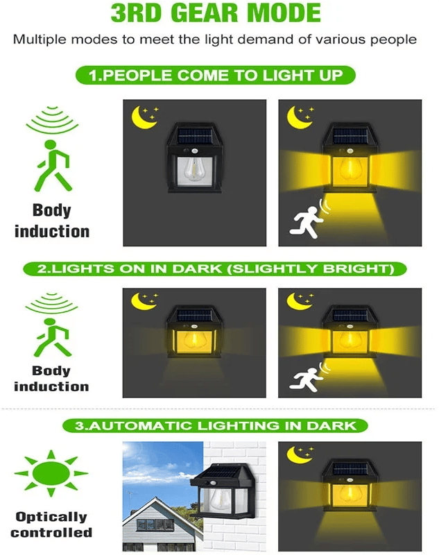 Smart Motion Sensor: The solar wall light has a built-in intelligent motion sensor that sensitively detects motion within a 120° angle within 8 meters. Press the on/off to switch 3 different modes: [1]When motion is detected, the wall light will turn on to 100%, and will be off after the movement leavs for 15s. [2] When motion is detected, it will turn on to 100%, the solar wall light will change to 50% brightness after the movement leaves for 15s. [3] Always keep 50% low brightness mode all night.
