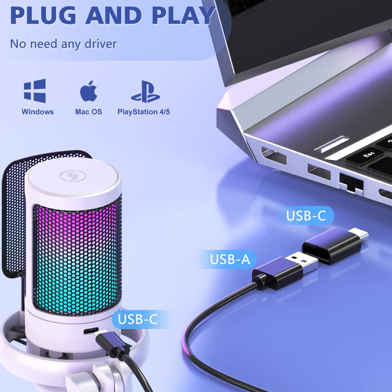 - Plug and Play Setup: No additional driver is needed. This microphone for streaming is plug-and-play for PC, laptop, macbook, PS4/5 or all Type C phones, tablets and PC (requires USB C to USB adpter - package contains). Not compatible with xbox.